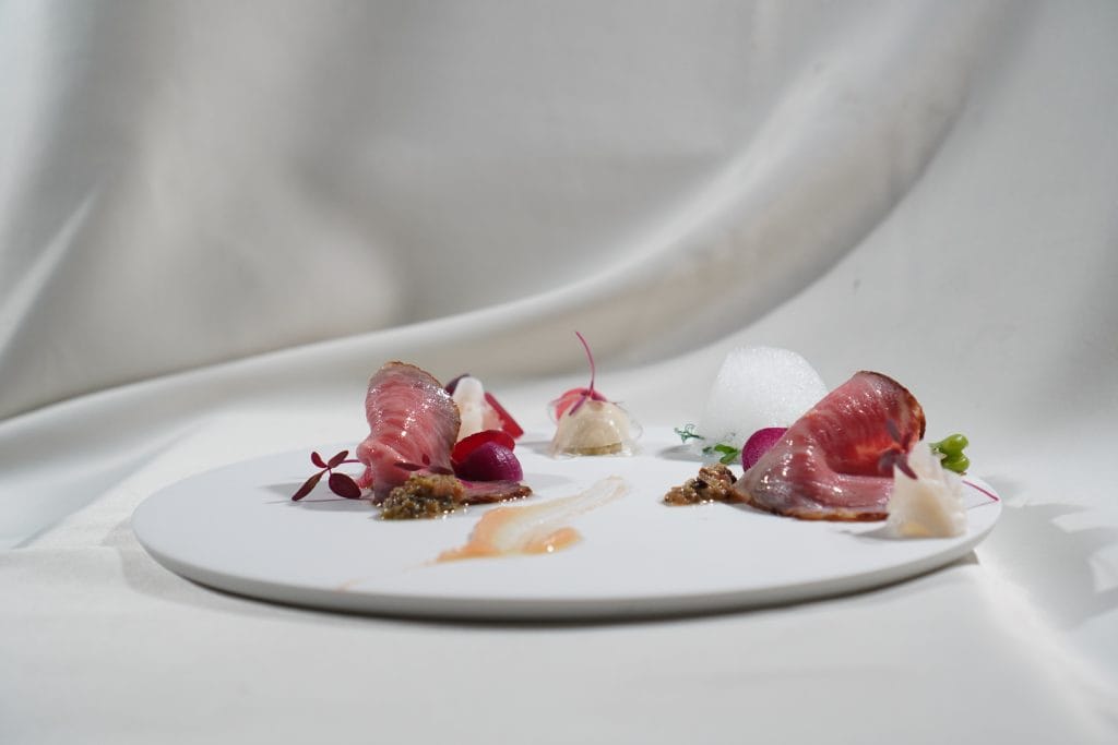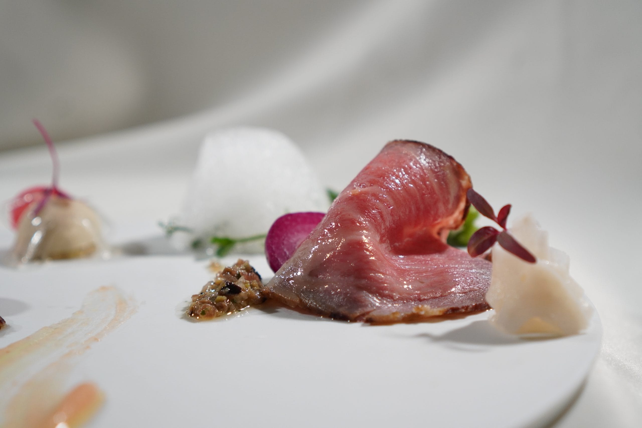 釣り漁で穫れる新鮮で、脂の臭みが少ない金目鯛を使用。ひと口目のインパクトと旨味を最大限引き出すために、鱗を残したままの金目鯛を生ハムでマリネし、生ハムの旨味を魚にじっくりと移します。