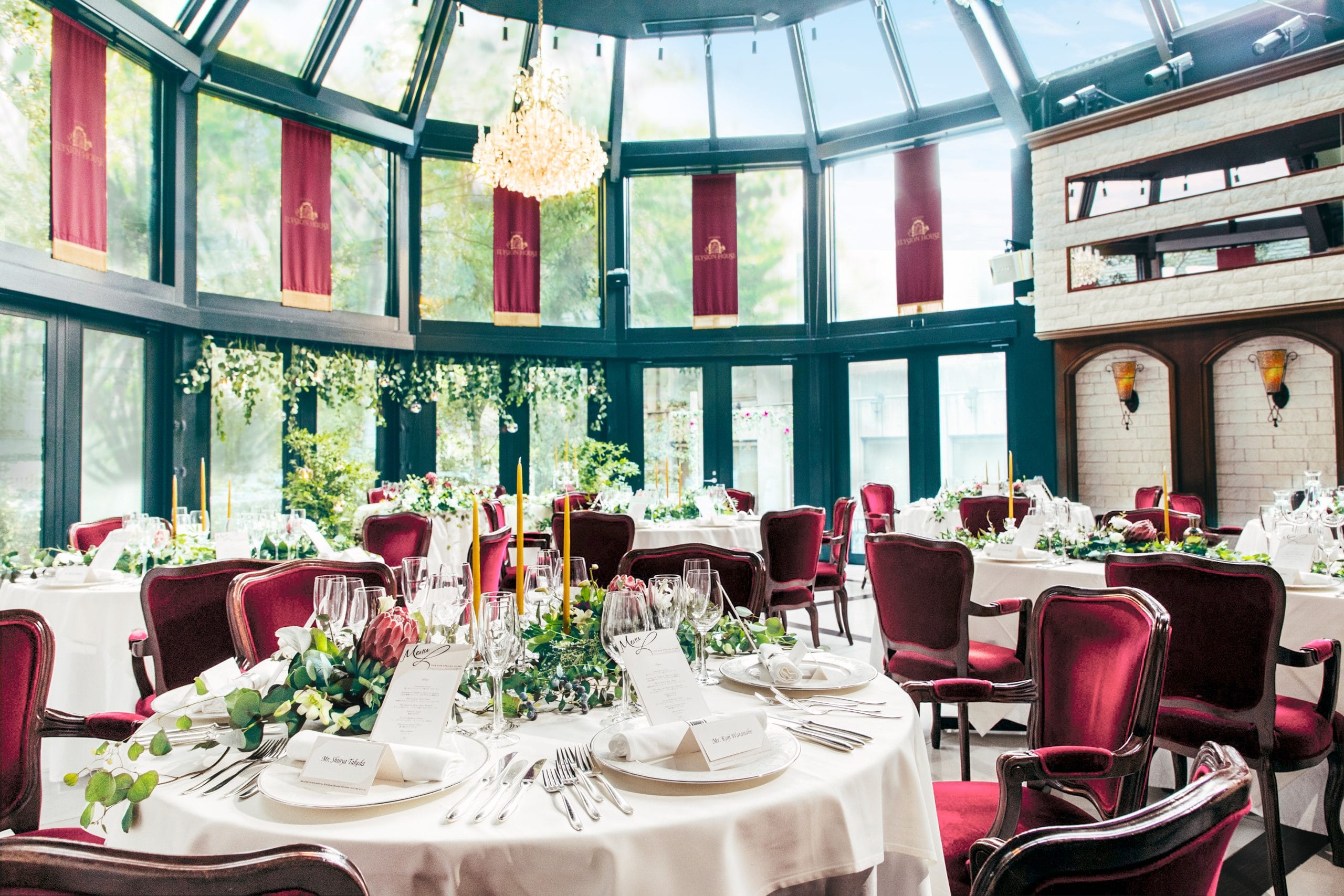 広大なガラス張りのドームと高い天井を備えたメインダイニングと、緑豊かな庭園を自由にコーディネートして、大切な人たちとの特別なひとときをお過ごしください。