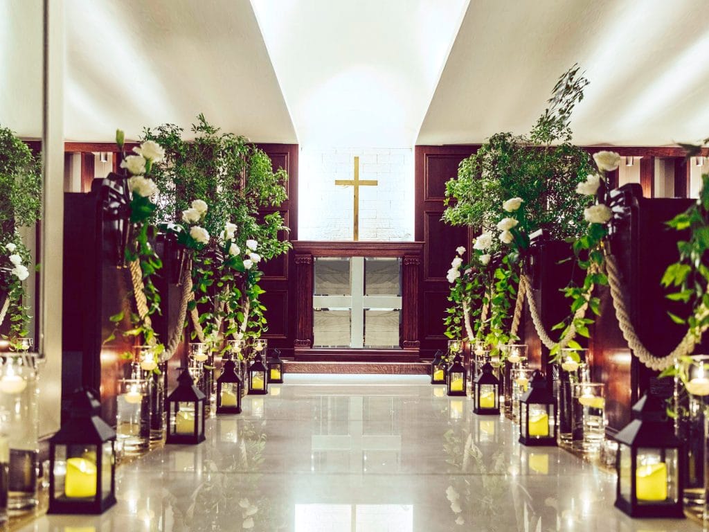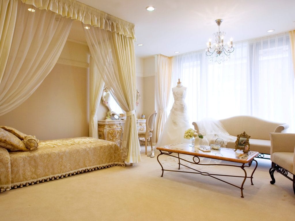 常設のチャペルや新婦のためのゴージャスなプライズルーム、新郎の控え室や複数のゲストルーム。さらにはゲストの為のパウダールームやラウンジ、常設の音響設備など。